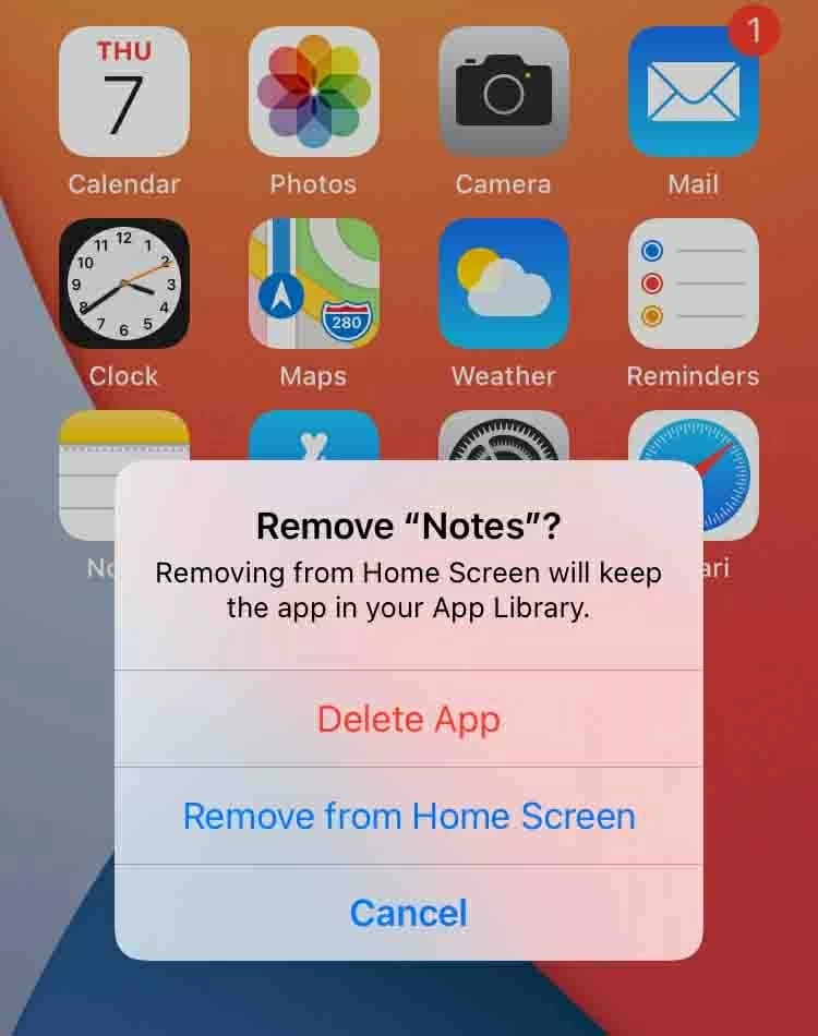It's also possible that the Notes app has been disappeared iPhone Home screen but in the App Library if your iPhone is running iOS 14 or later. This takes effect when you tap "Remove from Home Screen" option in the Remove App notification. Simply go to App Library, tap and hold on Notes and select Add to Home screen.