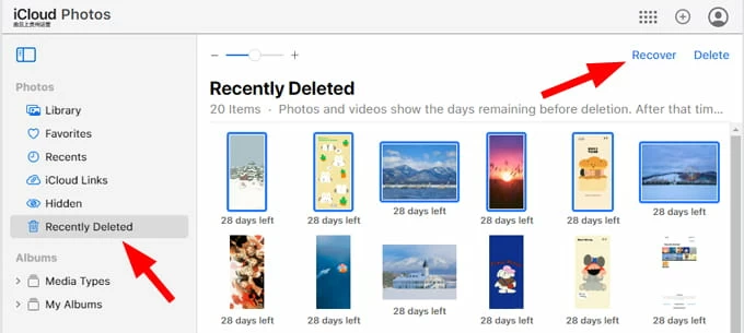 1. Restore from iCloud Photos. If you can't unlock your iPhone to access Photos library to see if the lost photos are stored in Recently Deleted folder, you may log into iCloud website to check your iCloud Photos and restore your photos from Recently Deleted.