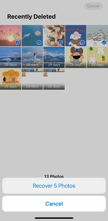 6. Select the deleted photos you'd like to restore from the screen, then tap "Recover" at the bottom right corner. It will prompt you how many pictures are selected to restore.