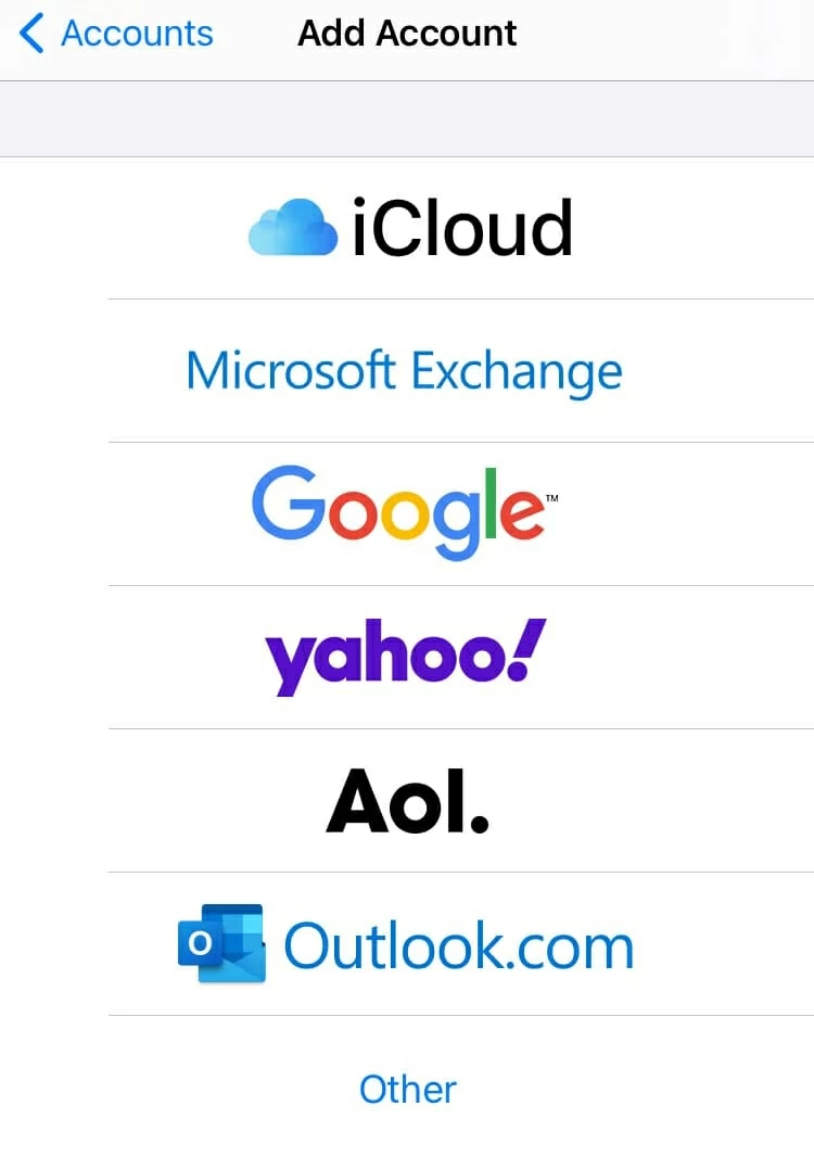 3. There you'll find you can add iCloud account, Microsoft Exchange account, Gmail, Outlook account, etc. Just select the account according the type of your old work email account. Or, you can tap Other.