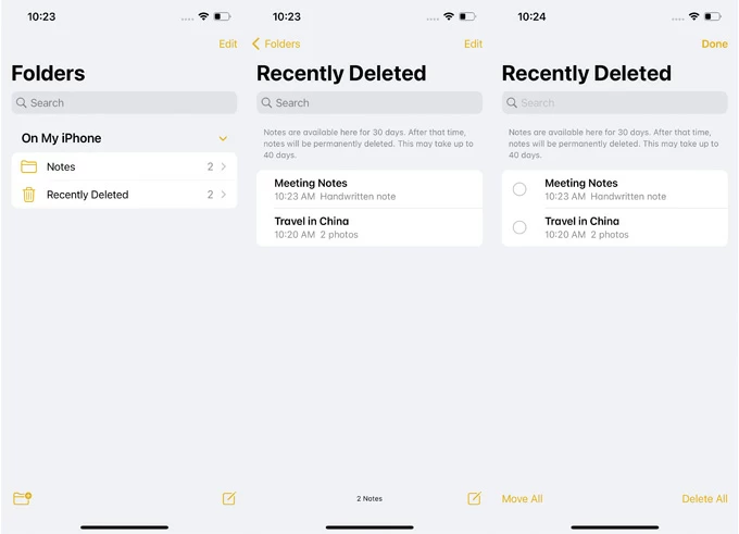 Sometimes you may have accidentally deleted notes, so you can't find them in the note list. Deleted notes will be moved to a Recently Deleted folder in Notes app, which will keep your deleted notes for up to 30-40 days before automatically deleting them permanently. You can restore disappeared notes to iPhone by accessing Recently Deleted album.