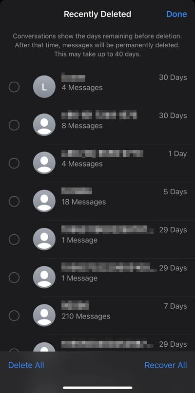 iOS 16 introduces a built-in temporary storage area named Recently Deleted for SMS and iMessages you deleted within 30 days, making it easier to access iMessages in the absence of a backup. Once the countdown reaches zero, iOS 16 automatically erases the iMessages from Recently Deleted folder.