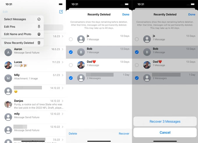 Fortunately, deleted iMessages are not gone forever. In iOS 16 and later, the Recently Deleted folder in Messages allows you to recover iMessages on iPhone 14 within 30 days.