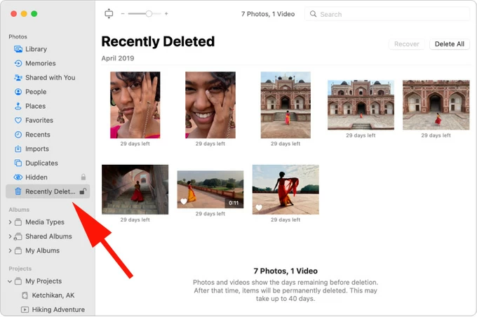 1. In the Mac Photos app, click Recently Deleted in the sidebar. Can't see Recently Deleted album in the sidebar? Your all deleted photos should be permanently erased from the album. Try the next method.