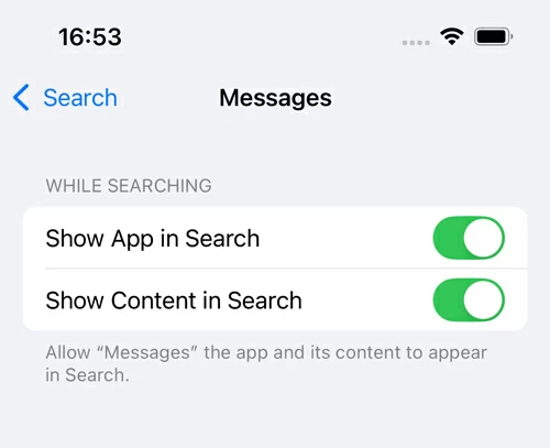 For the best result, turning message indexing off and back on through iPhone's Siri & Search settings will often clean up the problem with Messages app that leads to missing SMS or iMessage photos during an iOS update. To do this: