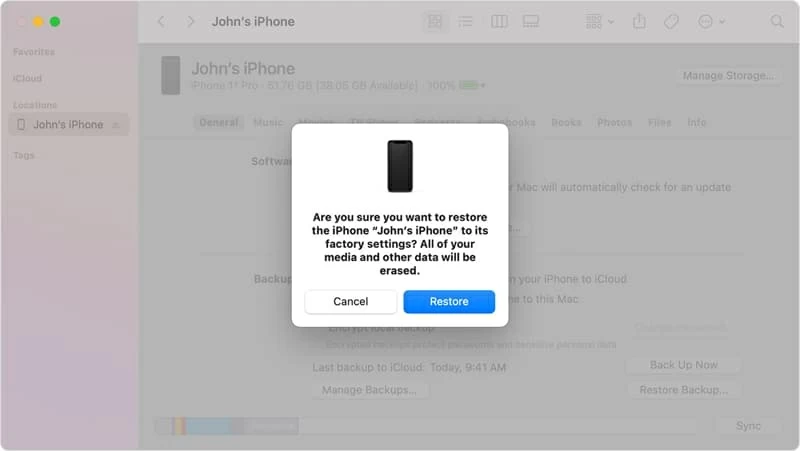 4. A pop-up messages will prompt you that your iPhone will be restored to factory settings. If you decide to proceed with the fix, just click Restore.