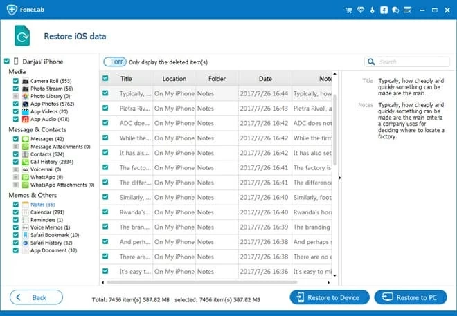 Once the backup for notes is made, click Restore iOS Data button, and view the backup.