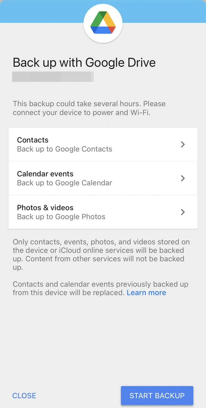 The downside is that there are just 3 types of iPhone data you can back up to Google Drive: Photos and Videos, Contacts and Calendar Events.