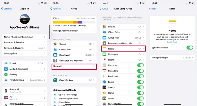 To sync iPhone notes to iCloud and create a backup, go to Settings > [your name] > iCloud, tap on "Show All" and choose "Notes," then turn on "Sync this iPhone" option. And if your other iOS devices are signed into iCloud with the same Apple ID and also have the sync feature enabled on iPhone, you will be able to see notes from other devices in the Notes app.