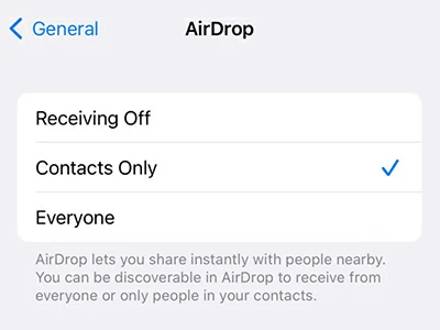 1. On your iPhone, go to Settings > General > AirDrop, then select Contacts Only or Everyone.