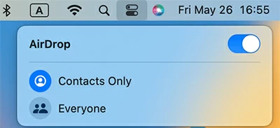 2. On your Mac, open Control Center at the upper right corner on the screen, click AirDrop and select Everyone or Contacts Only.
