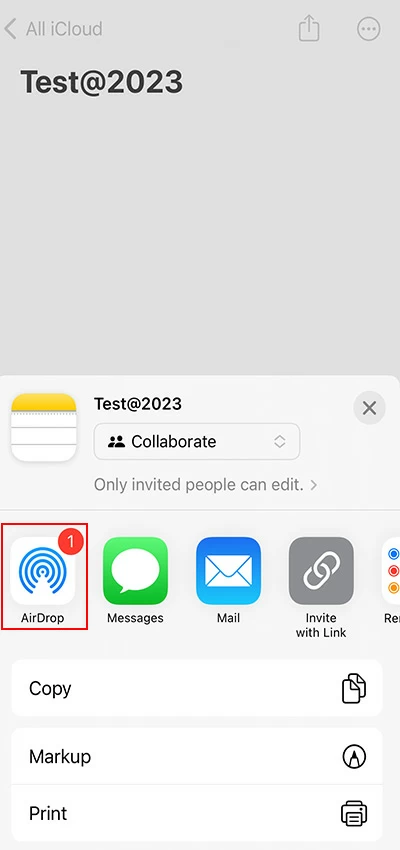 4. Tap the Share button at the top right corner, select AirDrop, and click your Mac's name to send the note.