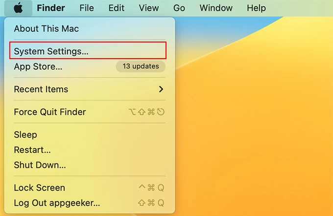 1. Click the Apple logo at the top left corner of your Mac's screen, and select System Settings from the drop-down list.
