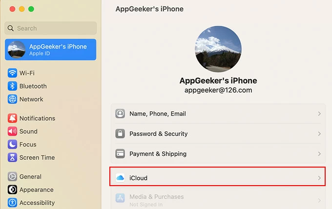 2. Click your name at the top of the left sidebar, and then select iCloud on the right side.