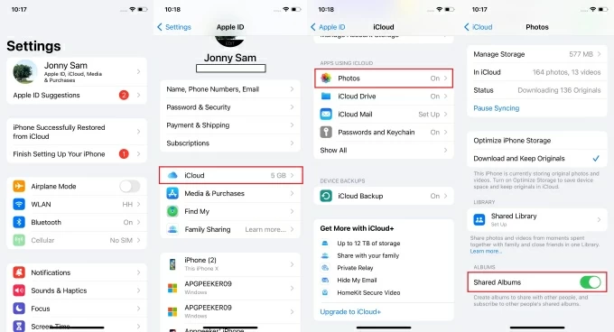 1. Make sure you set up Shared Albums. On your iPhone, head to Settings > [your name] > iCloud > Photos and scroll down to switch Shared Albums on.
