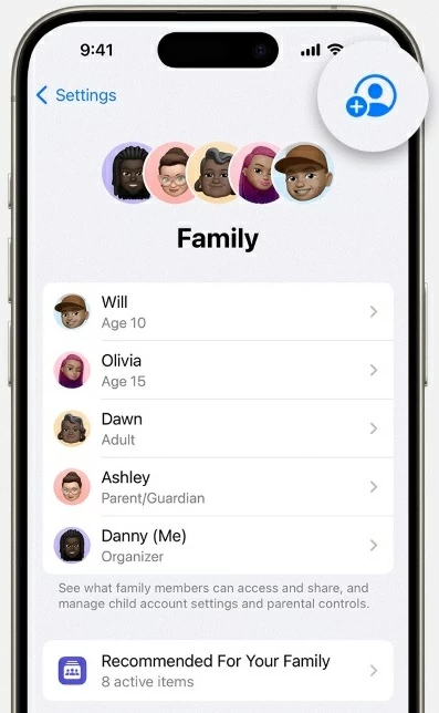 1. Tap the Add Member icon in the top right corner in Settings > Family.