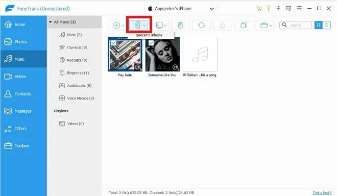 With a USB cable, a third-party tool that's particularly designed for data transfer among Apple devices, called Appgeeker iPhone Data Transfer, is a good way around. It never put a limit on the number of music files you want to transfer. You can transfer as many files as you like. Plus, it supports various types of music files like your playlists, podcasts, audiobooks, and even the voice memos for your convenience.