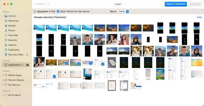 Step 5: Click on the Import Selected or Import All button at the top right corner of the Photos app window.