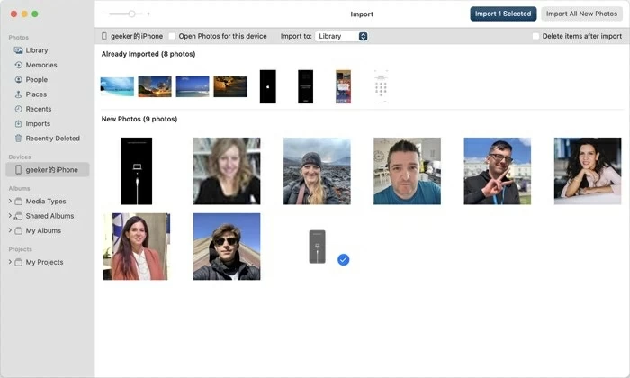4. Click "Import [number] Selected" or "Import All New Items" in the upper right corner. You can check your transferred photos in the Imports section on the left sidebar.