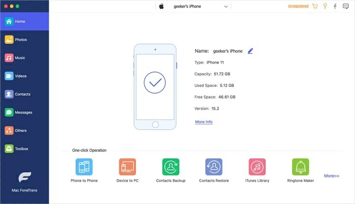 Download iPhone Data Transfer and install it on your Mac. Launch it. Follow the prompts to connect your iPhone and Mac with a USB cable. When the software recognizes your device, the details of your iPhone will appear on the main screen like the screenshot below.