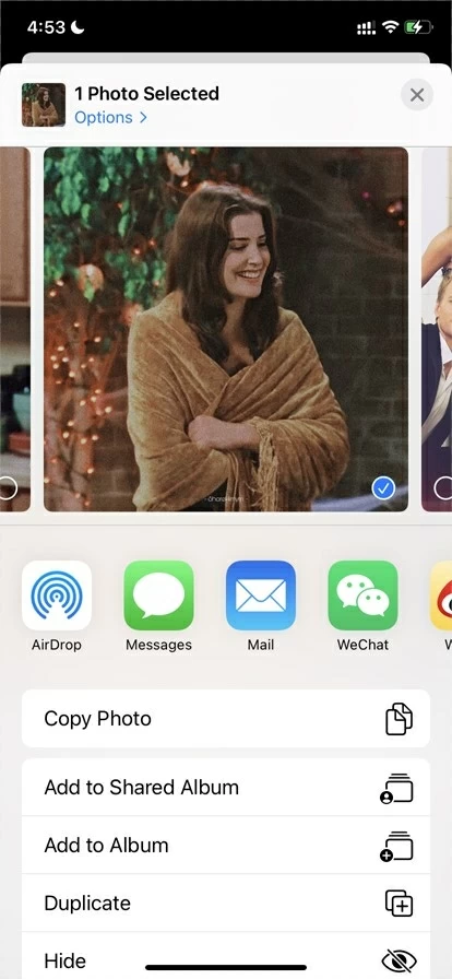 1. Open Photos app on your iPhone. Select the photos you want to transfer to your Mac. Click the "Share" icon with an up arrow at the bottom of the screen.