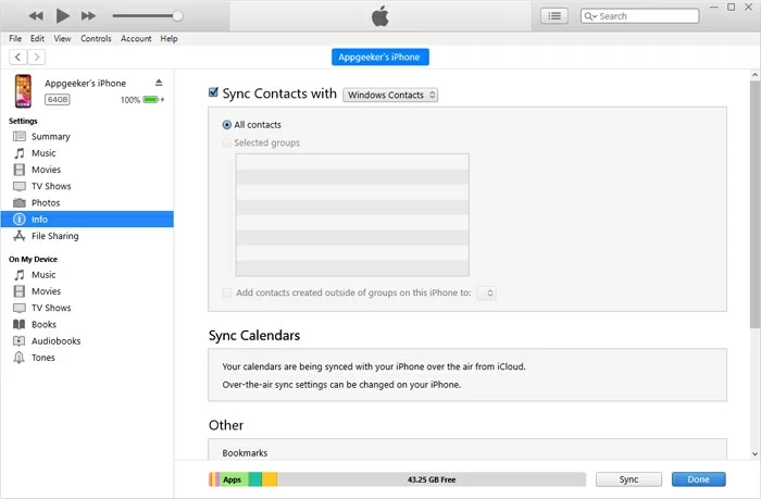 Syncing contacts on your old iPhone with iTunes is also a feasible way of transferring phone numbers and other contact details to the new one. Keep in mind that the process will replace the selected information on your target iPhone with the content you synced from your old devie with your iTunes library.