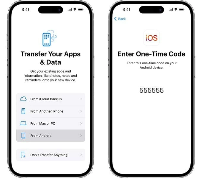 2. When you get to the "Transfer Your Apps & Data" step, select From Android, then tap Continue, and a ten-digit or six-digit code will appear.