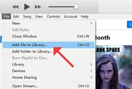 At the top of iTunes, click "File," followed by "Add File to Library" or "Add Folder to Library" to add music file from your computer to library.