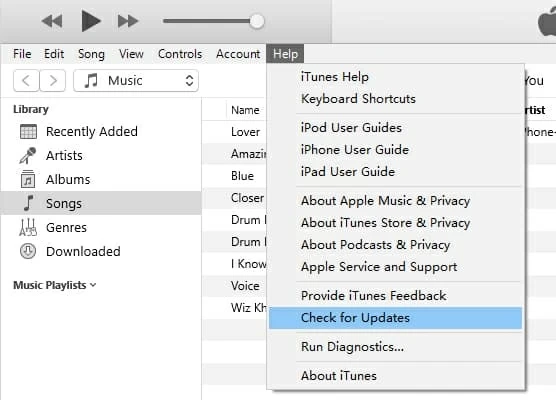 Before transferring music from computer to iPod, make sure you have updated iTunes to its latest version. To check that: open iTunes, click on "Help" from the top of the window. Then choose "Check for Updates."
