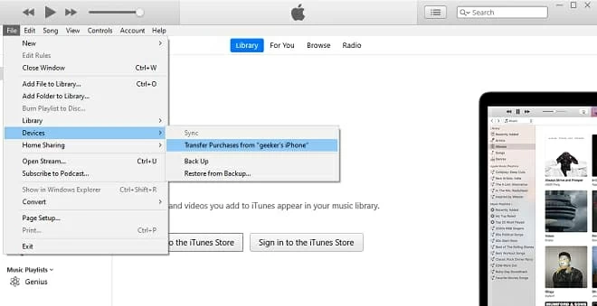 2. From the top toolbar, click File > Devices > Transfer Purchases from your iPhone. This will automatically move your purchased songs from the old iPhone to iTunes Library.