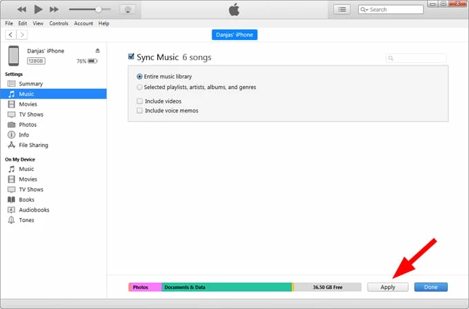 6. To start automatically syncing music to iPhone from iTunes, click Apply at the lower right corner of window.