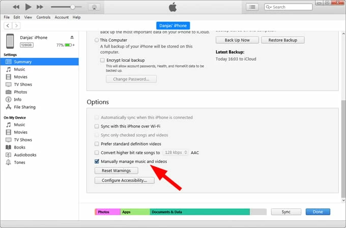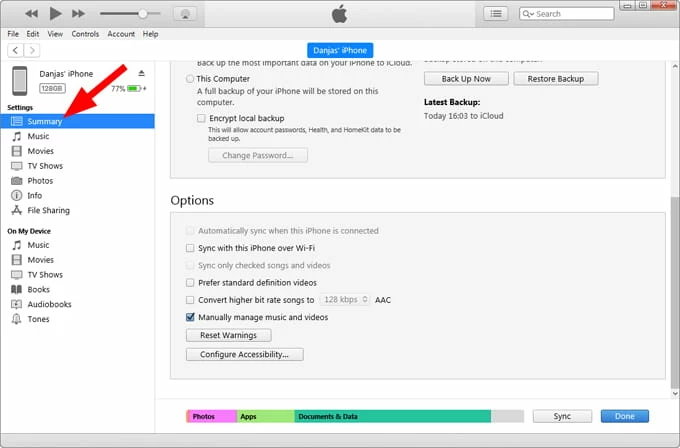 In Summary section, you will get option to manually transfer your music and playlists to iPhone.