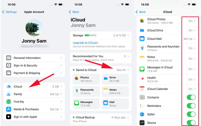 When you passed the setup phase and didn't transfer your iPhone data to the new iPhone 17, another device-to-device transferring solution is to take advantage of iCloud syncing so that everything is exactly as you are used to it being. Enabling iCloud syncing on the new iPhone 17 to transfer apps & data from your old one should make it easy to transfer iCloud to your new iPhone after setup flexibly. This supports specific data categories such as Photos, Notes, Contacts, Calendar, Reminder, Email, etc.