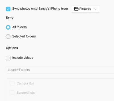 3. In the sidebar, select Photos, then toggle Sync photos onto [your iPhone] from.