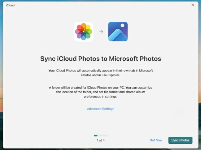 3. When you see the "Sync iCloud Photos to Microsoft Photos" wizard, click Sync Photos in the bottom right corner.