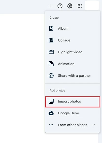 2. Click the plus (+) icon in the upper right corner, select Import photos, then browse your computer and choose the pictures you need.