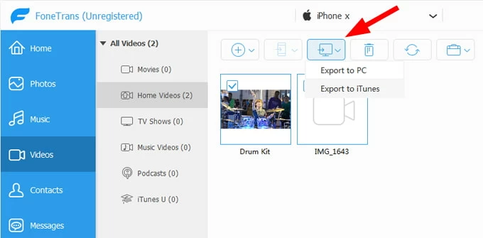 By the way, if you want to do a reverse of your video transfer, from iPhone to Windows 11, simply click the PC icon in the top menu, then select "Export to PC," or select "Export to iTunes" if you want to save videos to iTunes library.