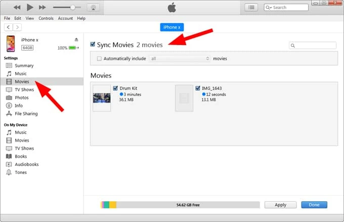 Tip: If you want to transfer just certain videos to your iPhone, don't check the box, but go to "Movies" list, and select the movie file(s) you want to sync.