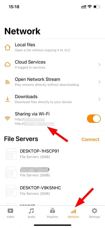 3. On the Network screen in VLC app, turn on "Sharing via Wi-Fi," and copy the IP address.