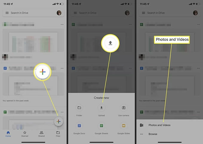 2. Open the app, tap the + button in the bottom-right corner, and select Upload.
