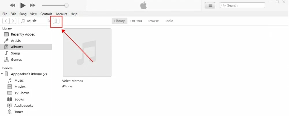 3. Click the "device icon" in the top-left corner of the iTunes window.