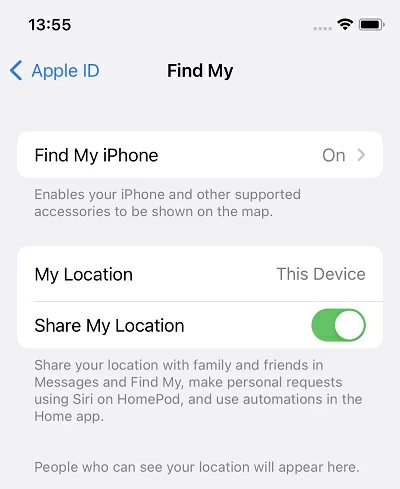 Although you have turned on Location Services, if you or your friends don't activate Share My Location, your locations can't be shared in Find My, resulting in the problem of Find My Friends not working. Open the Find My app and navigate to the Me tab, then turn on the Share My Location option. Or you can go to Settings > [your name] > Find My and turn on the switch for Share My Location.