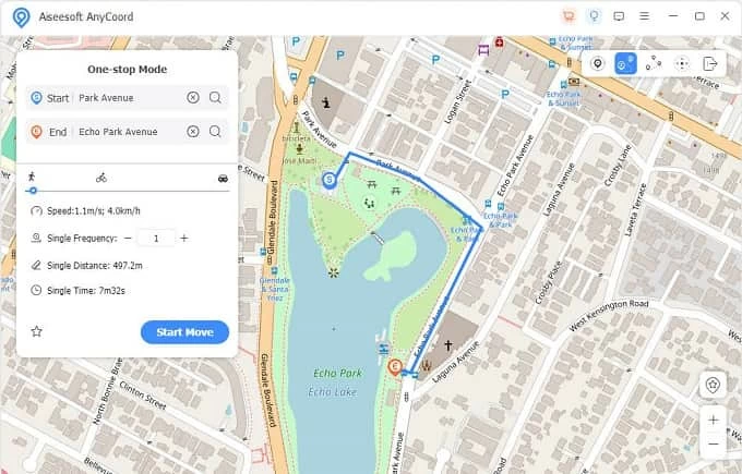 After you launch the software and plug your iPhone into the computer, click One-stop Mode or Multi-stop Mode, then select your starting point and your final destination, choose a vehicle of walking, cycling or driving, set the preferred speed, and press Start Move button. The tool simulates GPS movements as you drew on the map.