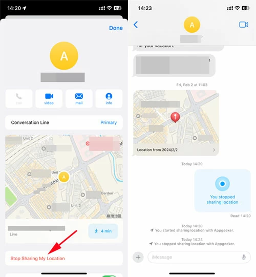 If an iPhone stops sharing location in iMessage, it could be recognized "You stopped sharing location with [the other person's name]," and other party's message screen displays [your iPhone's name] location is expired.