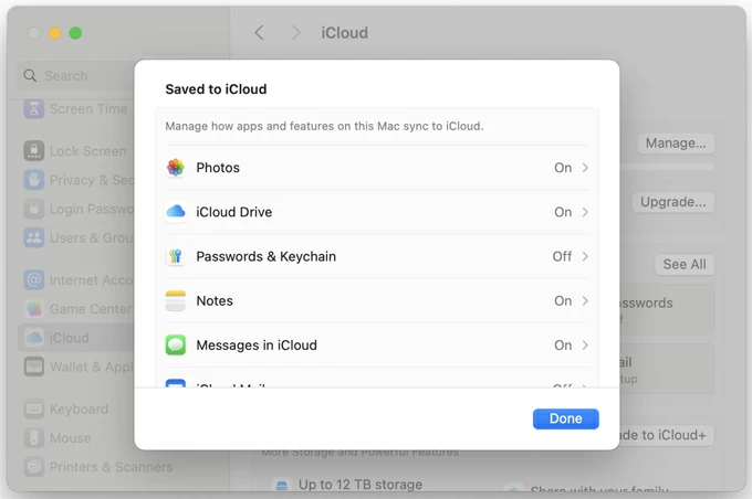 Enable iCloud to back up your Mac: open System Settings > Click [Your Name] at the top > iCloud > Sign in with Apple ID > Under Saved to iCloud, click to choose which apps you want to sync and store data with iCloud.