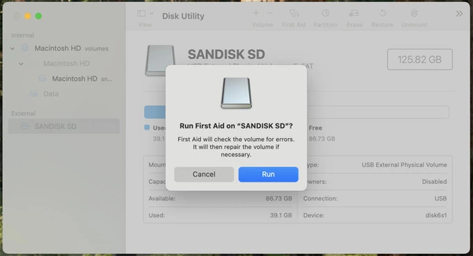 5. When prompted, click "Run" to begin checking and fixing errors. In the following example, the last volume on the disk is SANDISK SD.