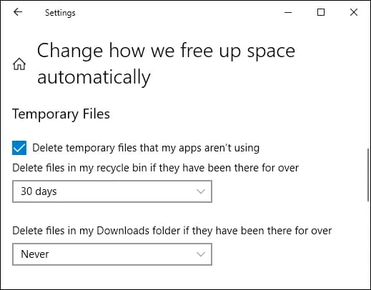 4. In the next page that opens, head to Temporary Files section. You will want to tick the box next to "Delete temporary files that my apps aren't using" to enable it.
