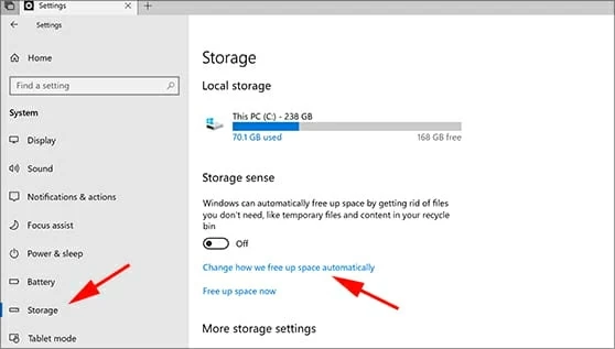 3. Navigate to System > Storage, and then click "Change how we free up space automatically" on the right pane.