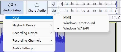 Open audacity and customize the recording settings. Select Windows WASAPI in the Host panel from the Audio Setup drop-down menu.