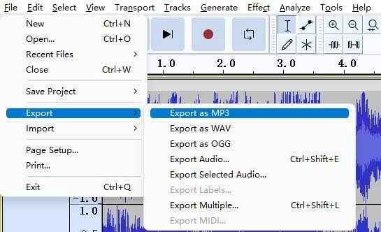 Finally, save your recording at a suitable location. Hit the File menu and Export the file as MP3.